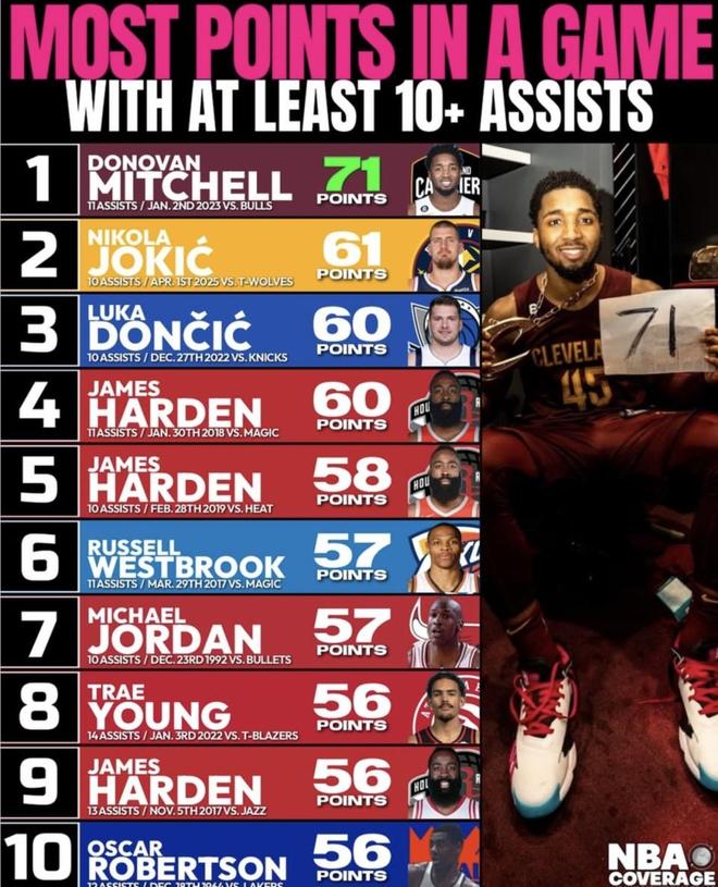 乔丹(Michael Jordan)国籍:美国年龄:29岁俱乐部:芝加哥公牛得分:57分助攻:10次日期:1992-12-23对手:华盛顿子弹最终比分:公牛 107-98 子弹(胜)扬(Trae Young)国籍:美国年龄:23岁俱乐部:亚特兰大老鹰得分:56分助攻:14次日期:2022-01-03对手:波特兰开拓者最终比分:老鹰 131-136 开拓者(负)哈登(James Harden)国籍:美国年龄:28岁俱乐部:休斯顿火箭得分:56分助攻:13次日期:2017-11-05对手:犹他爵士最终比分:火箭 137-110 爵士(胜)