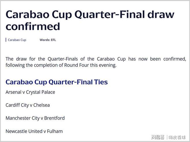 联赛杯16强(第四圈)全部结束,派出替补阵容的利物浦,本赛季第三次负于水晶宫,成为曼联之后,又一个出局的传统六强,一共有13支英超球队被淘汰。随后,八强的抽签仪式已经完成,切尔西遇上大礼包,阿森纳又要面对水晶宫。16强的8场比赛中,利物浦主场迎战水晶宫是大家关注的焦点。赛前,利物浦近6场比赛输了5场,水晶宫近4场也输了3场,两队都是高开低走典型代表,而且双方的转折点,似乎都发生水晶宫在联赛击败利物浦的那场比赛之后。不过,利物浦并没有派上主力,替补席上清一色年轻球员,年龄最大的只有21岁,面对认真应付的水晶宫,主场三球惨败,连续三次不敌对手。赛后,斯洛特解释,利物浦只有15到16人可用,即使派上全主力,也未必能够击败水晶宫,所以使用替补的决定是正确的。多支英超强队也是派出半主力的阵容,跟利物浦不同的是,替补席上没有那么“极端”,留下很多主力,可以随时出场。切尔西面对英超垫底的狼队,上演了一场进球大战,最终4-3险胜。刚刚复出的德拉普,在比赛末段领到红牌,这是切尔西近9场比赛中的第6次,似乎没有红牌就不会比赛了。所幸的是,少打一人的切尔西很快扩大比分,尽管补时阶段被对手破门,也能勉强保住胜利的比分。阿森纳和曼城,分别顺利击败对手,成功晋级。纽卡斯尔和热刺,是本轮另外一场实力比较接近的对决,沃尔特马德锁定最终的比分,纽卡斯尔近6场赢了5场,状态已经回来了,热刺则令人担忧,近7场仅2胜。利物浦领衔,本轮有4支英超球队出局,上一轮也有4队,第二圈包括曼联在内,有5队被淘汰,一共有13支英超球队离开了联赛杯。至此,联赛杯八强出炉,包括曼城、阿森纳和切尔西三支传统六强,还有纽卡斯尔、水晶宫、布伦特福德和富勒姆,以及来自英甲的卡迪夫城。根据联赛杯官网的消息,八强对阵形势分别为,阿森纳面对水晶宫,卡迪夫城面对切尔西,曼城面对布伦特福德,卫冕冠军纽卡斯尔面对富勒姆,前者为主场,安排在12月17日的那个周中,具体的比赛时间待定。显然,切尔西抽中了大礼包,这是八强唯一的非英超球队,卡迪夫城此前分别遇上斯文登、切尔滕汉姆、伯恩利和雷克瑟姆,并没有遇上太强的球队,想要击败切尔西,机会应该不是很大。布伦特福德很有意思,本赛季分别击败曼联和利物浦,战平切尔西,偏偏只输给曼城,双方在联赛杯再次碰面,结果会是怎样的呢?几天前,阿森纳凭借埃泽一锤定音,攻破老东家大门,击败水晶宫之后,两队再次在联赛杯相遇。同样地,纽卡斯尔几天前击败了富勒姆后,想不到的是,大家也要很快相遇。四支实力较强的球队,刚好在八强全部错开,没有强强对话,相信来到半决赛,才会更加激烈。联赛杯八强在欧冠第6轮之后的一周举行,随后的周末是非洲杯开幕式,紧接着是圣诞快车和新年赛程。已经出局的利物浦和曼联会轻松一些,可以有更多时间应对年末的比赛。联赛杯半决赛依然采用两回合主客场方式,晋级的球队会十分辛苦,决赛安排在明年3月22日,在温布利球场进行。