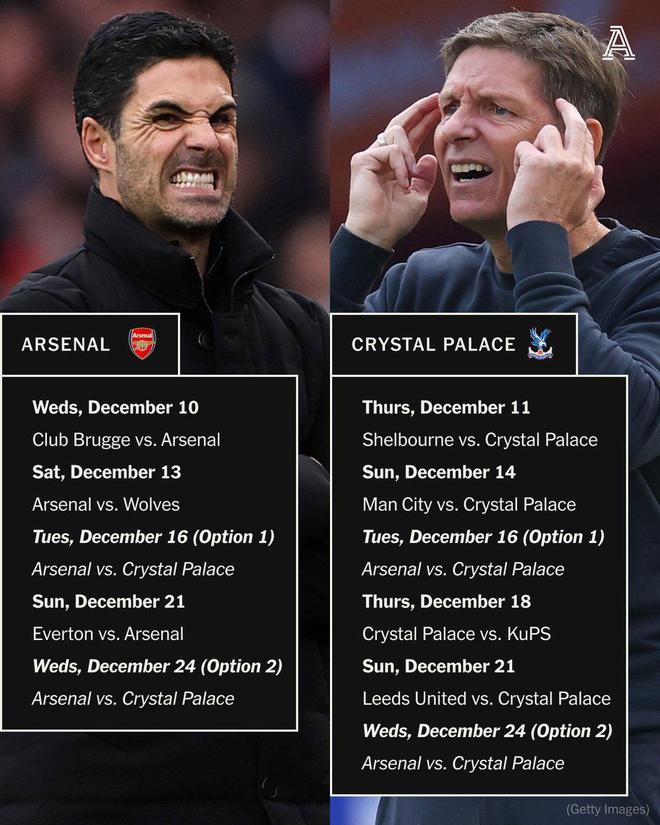 在周四凌晨进行的英联杯第四轮比赛中,阿森纳2-0击败布莱顿,四分之一决赛将面对水晶宫。根据统计,12月11日,水晶宫将前往都柏林,在欧协联对阵爱尔兰球队谢尔伯恩,这意味着水晶宫与曼城的英超联赛比赛将改在12月14日进行。之后,水晶宫将于12月18日参加另一场欧协联比赛——在主场迎战芬兰球队库普斯,然后于12月21日迎战利兹联。与此同时,阿森纳将于12月10日客场对阵布鲁日,12月13日主场迎战狼队,然后于12月21日迎战埃弗顿,这样一来,阿森纳在周中没有比赛,但水晶宫的比赛安排在周四。看来比赛日期要么是12月16日(这意味着水晶宫将在8天内踢4场比赛),要么是平安夜,英超联赛尚未确认节礼日及之后英国的转播安排,这可能会让情况更加复杂。这场比赛必须在半决赛之前进行,半决赛首回合比赛定于1月12日那一周进行,但双方都将在1月10日至11日左右参加足总杯第三轮比赛,因此没有时间安排英联杯四分之一决赛。圣诞夜比赛会很麻烦,圣诞节前一天,公共交通会在晚上开始减少,这会给球迷离场带来不便,而且由于12月24日是工作日,比赛必须安排在较晚的开球时间。然而,如果将比赛日期定在12月16日,就意味着水晶宫要在8天内踢4场比赛,其中包括5天内踢3场,这对所有相关人员来说都是巨大的挑战,尤其对球员而言更是如此。【上咪咕独家看英超】