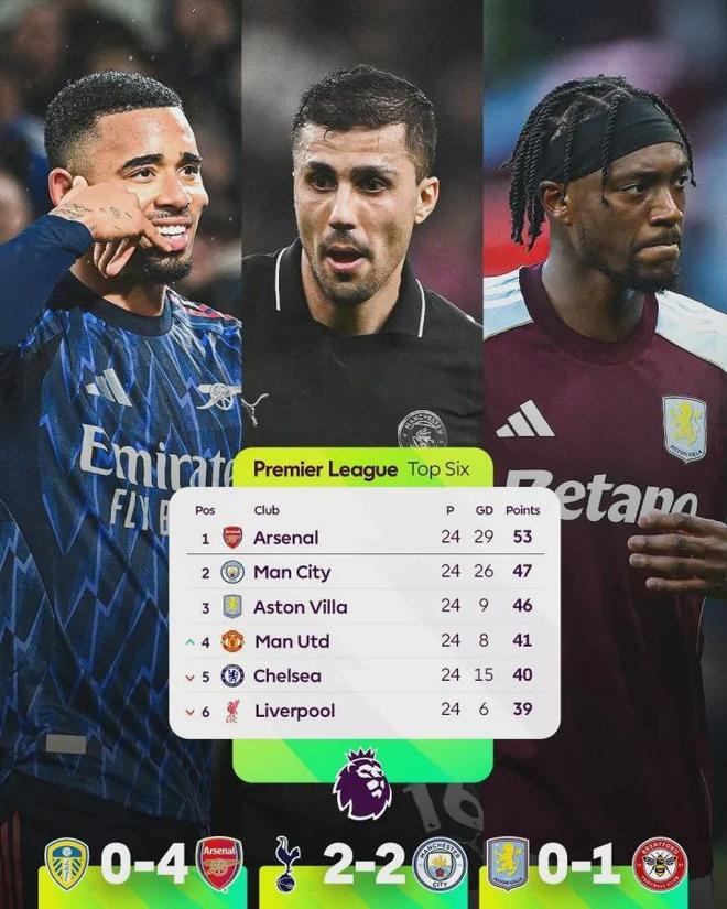 英超第24轮比赛,排名前3的争冠球队表现各不相同。在前一天进行的比赛,领头羊阿森纳客场4-0大胜利兹联,稳固了榜首位置。而随后出战的维拉却在主场0-1不敌10人作战的布伦特福德,而曼城则在客场2-0领先的情况下被热刺逼平。本轮英超前三的球队,只有榜首阿森纳赢球,他们也将领先优势拉开到了6分,成为本轮英超最大的赢家。