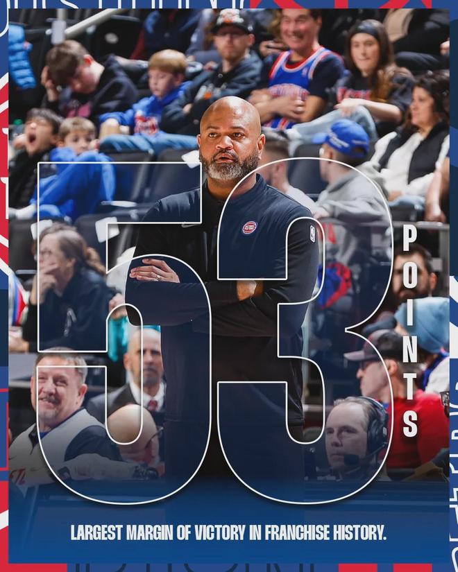 刚刚过去的1月份,快船胜率73.3%同期联盟第一,活塞胜率71.4%同期联盟第二。2月2日活塞130-77狂胜篮网53分,创造队史最大分差胜利,此前队史纪录是52分(2003年对阵凯尔特人)。毫无疑问,如今的活塞已经正式崛起了。