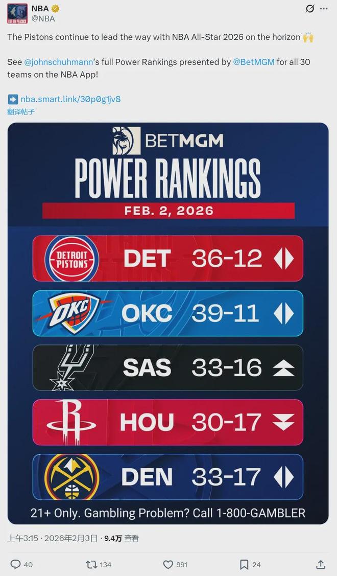 北京时间2月3日上午,NBA官方公布了最新一期的战力榜,活塞连续两周高居联盟第一,雷霆屈居第二,马刺反超火箭升至第三。来看看前十排名: