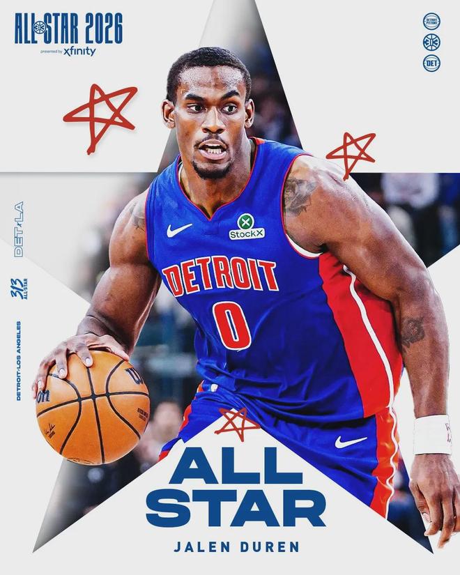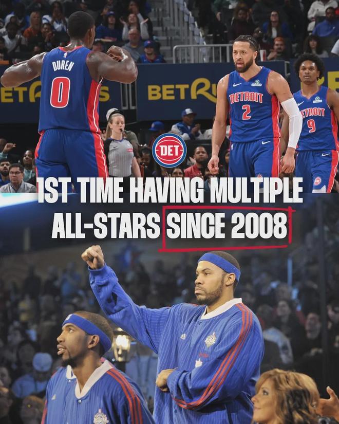 NBA全明星正赛名单已经公布,活塞两人入选:坎宁安东部首发,杰伦-杜伦东部替补。这是活塞队史自2008年以来,首次出现多人进入全明星。