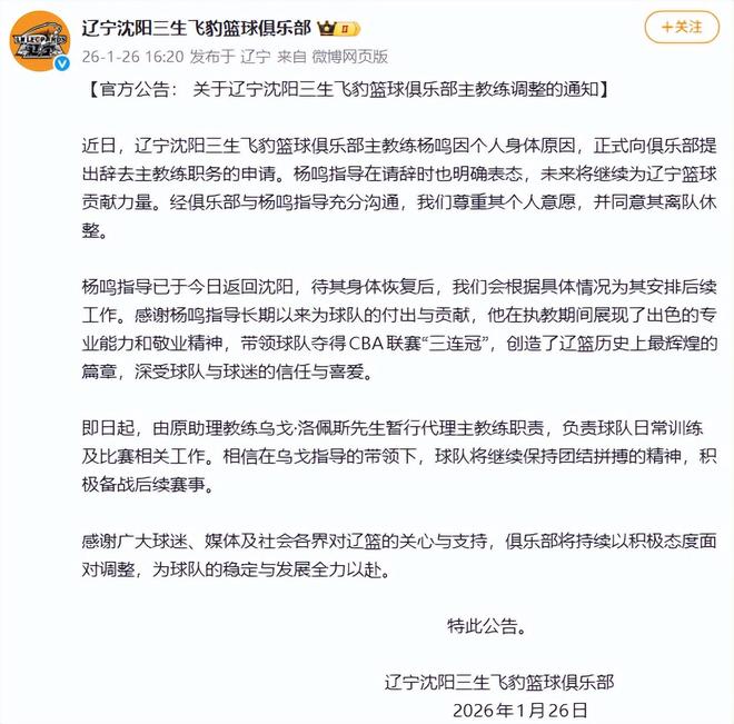 首先是辽宁队官方发布的公告里写着“杨鸣因个人身体原因辞职”。