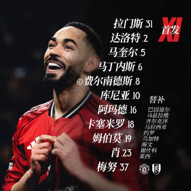 曼联首发:拉门斯/达洛特、马圭尔、利桑德罗·马丁内斯、卢克·肖/卡塞米罗、梅努/阿马德、B费、库尼亚/姆伯莫